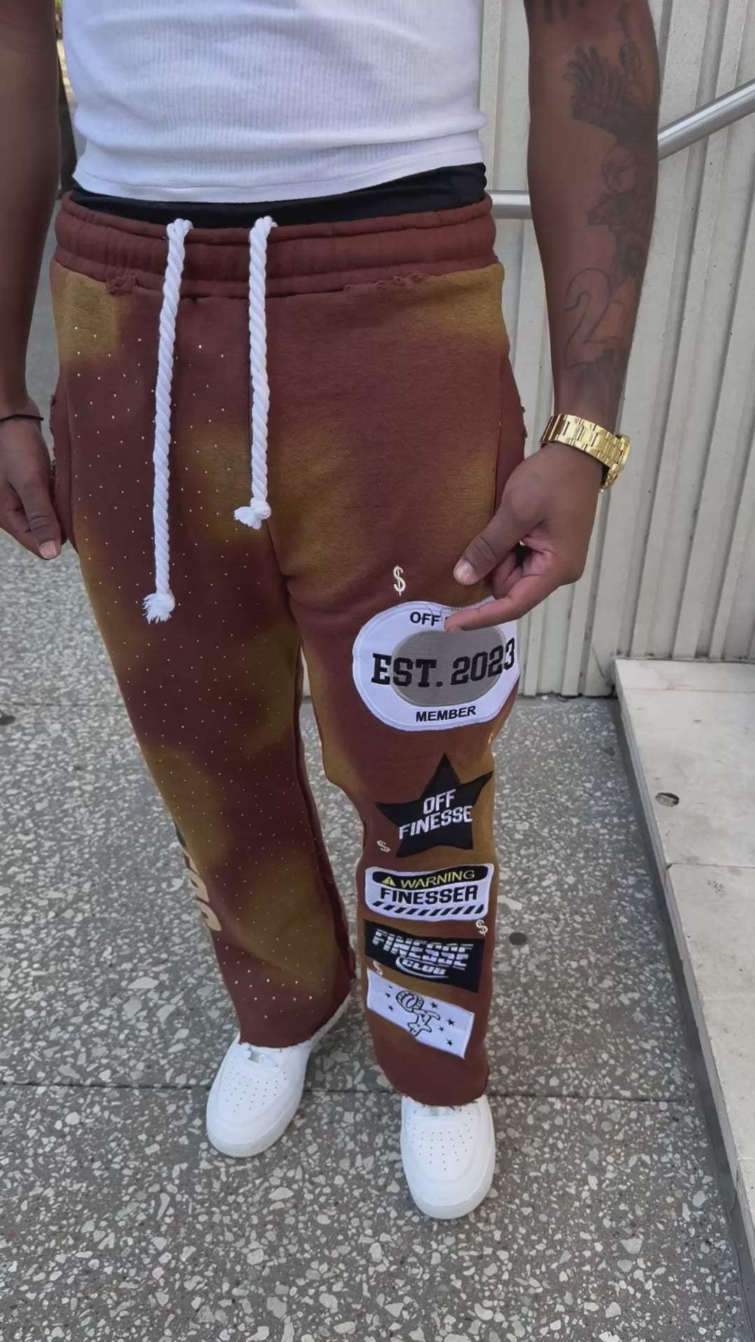The “Dooky” Patchwork Sweats ain’t for playing it safe. This is for when you wanna walk in and make the whole room look — heavy fabric, rhinestone hits, and patchwork logos that talk loud for you.